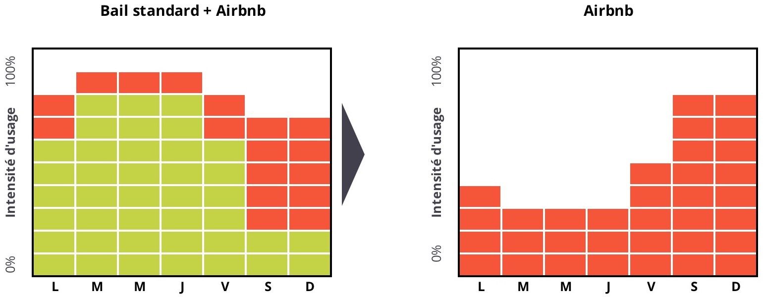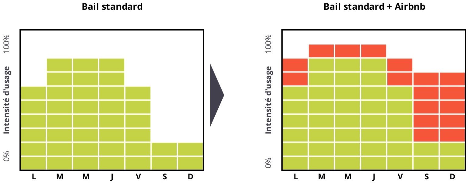 Le schéma à droite montre bien l’intérêt du modèle : en ajoutant un usage des lieux par des touristes de passage, le logement est désormais occupé à environ 80% sur l’année, sans investissement complémentaire.