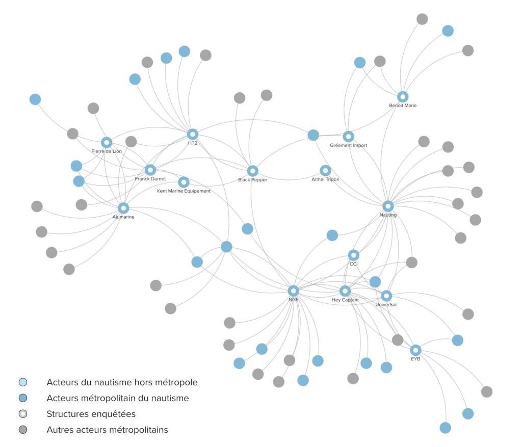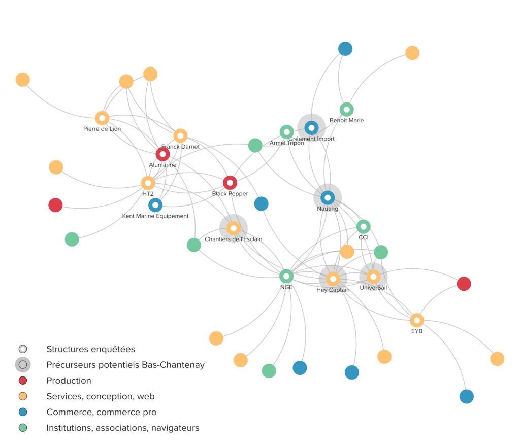 La méthode est simple, et fondée sur la rencontre de celles et ceux qui font la vie des territoires (ici les entreprises du nautisme dans la métropole nantaise). Partant d’une poignée de noms, nous avons peu à peu cartographié les relations de chacun, par une exploration de proche en proche.