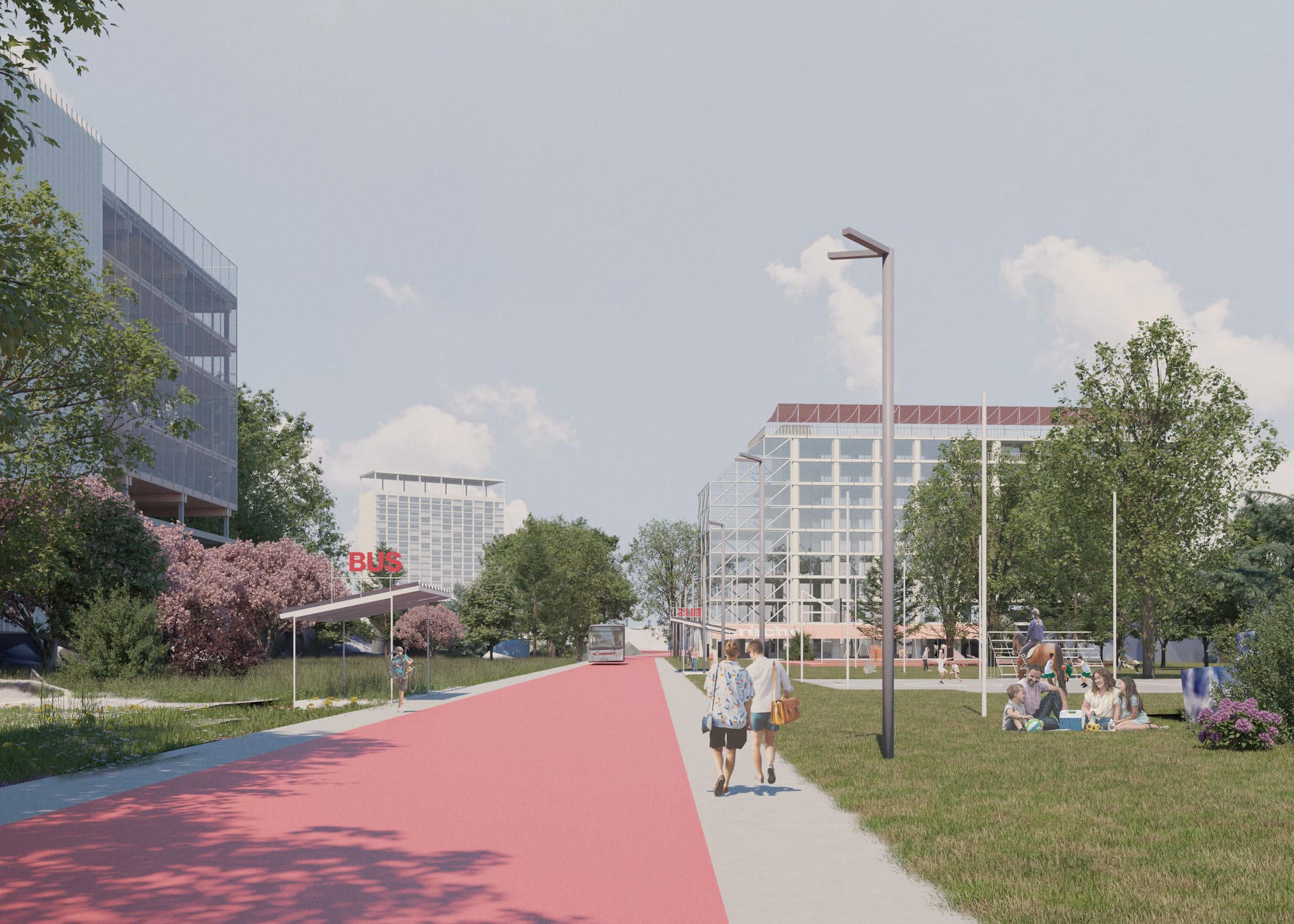 L’équipe Lafayette acte de la fin de la conquête de l’est, longue histoire de l’expansion urbaine lyonnaise. Pendant longtemps, l’horizon dégagé de la Porte des Alpes a donné l’impression que c’était le territoire de tous les possibles, apte à accueillir tous les usages. Alors, les objets urbains pionniers se sont alignés d’ouest en est dans une forme de ruée foncière. Mais le modèle du strip à l’américaine comme la consommation de terres agricoles font désormais partie du passé. Il faut inventer autre chose. L’équipe propose d’inverser la tendance en basculant l’axe est du développement vers l’intensification d’un axe nord-sud à construire. Ils partent d’un transport en commun structurant et s’appuient sur les délaissés entre les infrastructures et les plaques urbaines pour créer un nouveau parc linéaire. C’est aussi l’idée d’y créer de nouveaux espaces publics intenses qui viennent se glisser dans les interstices pour tisser des liens entre des ensembles qui se vivent aujourd’hui de façon autarcique. C’est aussi l’occasion d’intensifier les formes urbaines et d’accueillir des entreprises stratégiques.