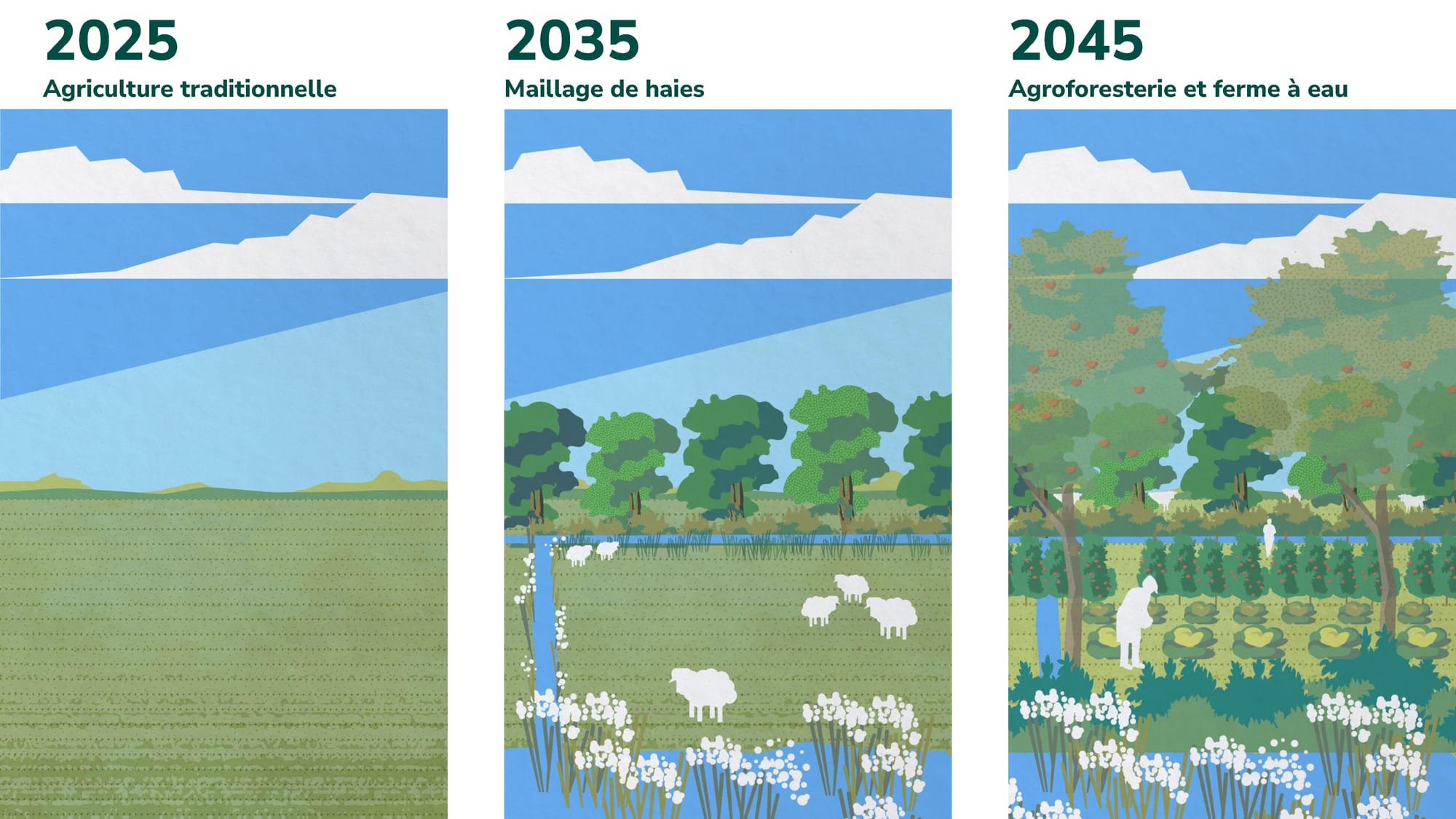 Cette question de l’eau est le fil conducteur de l’approche de l’équipe D&A qui constate l’assèchement des sols, la diminution de la ressource, la détérioration de sa qualité et les risques de ruissellement liés au changement du climat. Tous ces enjeux concernent directement le périmètre, situé sur une nappe d’importance stratégique pour l’alimentation de la métropole. Dans ce futur, la filière agricole s’est adaptée autour de l’agroforesterie, avec la plantation massive du secteur pour créer un inverseur local de climat. Le nouveau massif forestier est associé à un cycle de l’eau repensé par la captation des eaux de pluie, la valorisation des eaux grises et la création de fermes à eau, pour constituer une nouvelle infrastructure qui protège la nappe et régule le climat local. En s’immisçant dans les zones économiques, commerciales et résidentiels, cette infrastructure devient une formidable opportunité de leur transformation Reste à inventer un mode de faire à la hauteur de l’enjeu. Car pour libérer des espaces, régénérer les sols, structurer les infrastructures hydrauliques, planter et gérer ces espaces, il faudra nécessairement une gouvernance d’exception.