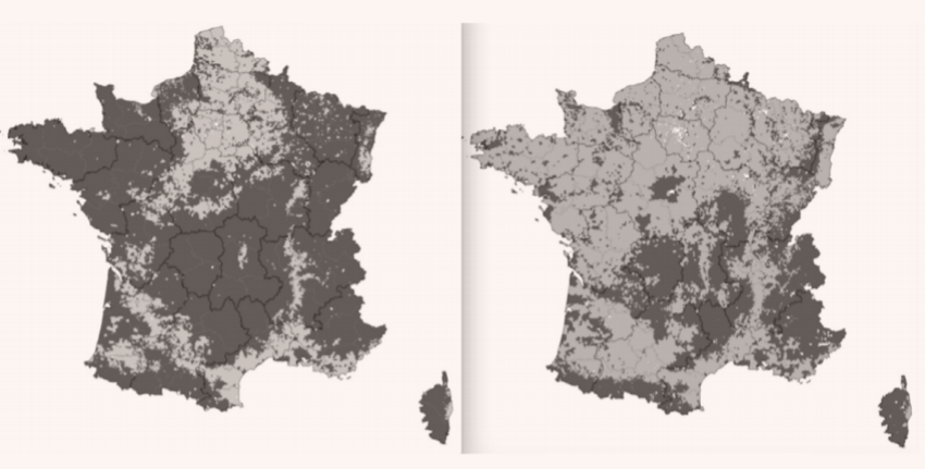 La carte ci-dessous présente l’évolution des espaces agricoles à « haute valeur naturelle », en gris foncé (à gauche : 1970 ; à droite : 2000) :