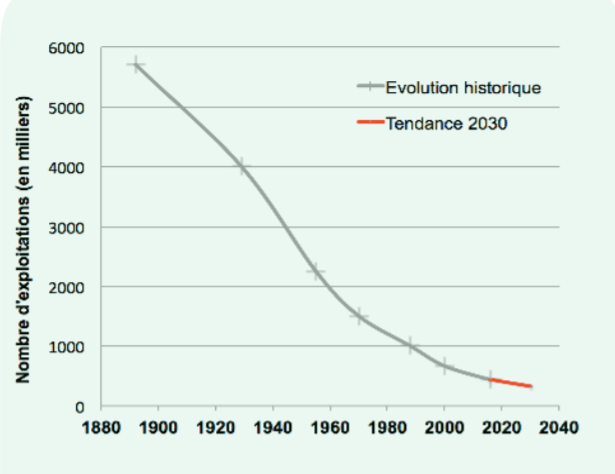 Ci-dessous, l’évolution du nombre d’exploitations agricoles en France depuis 150 ans :