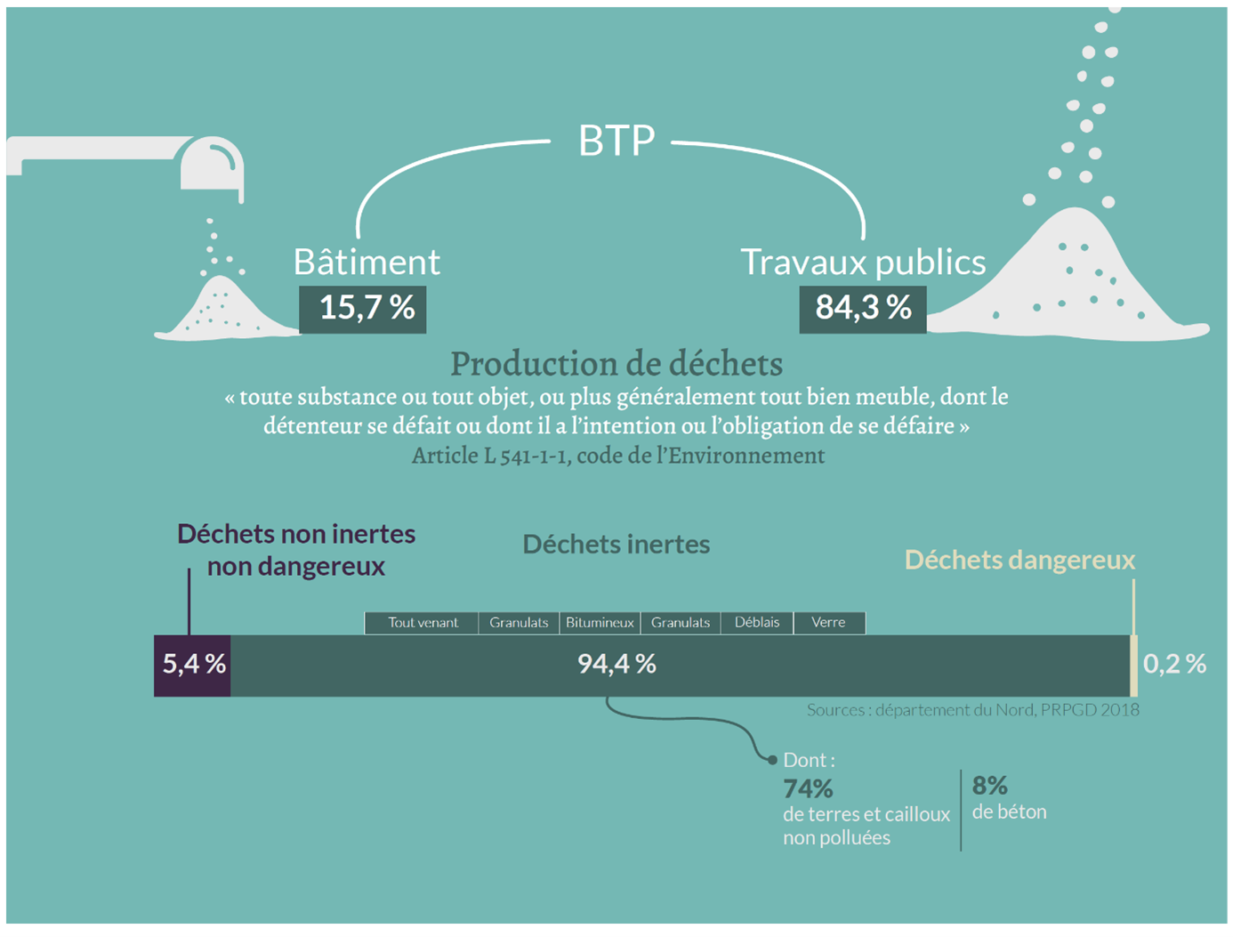 Figure emblématique de la ville en renouvellement, la métropole de Lille connaît depuis plusieures décennies une dynamique de transformation importante. A l'échelle du département du Nord, cette dynamique se retrouve dans les chiffres : 13 500 000 tonnes de matériaux de construction sont utilisées chaque année sur les chantiers du BTP. En sachant que le secteur de la construction est responsable de 40 % des émissions mondiales de CO2, on comprend la nécessité de mieux connaître ces flux de matière à l'échelle de la ville. Le Plan régional général de gestion et de prévention des déchets (PRGPD) donne quelques éléments de cadrage important : 84,3 % des déchets produits dans le secteur du BTP proviennent en réalité des chantiers de travaux publics, contre seulement 15,7 % pour le bâtiment. Les nombreuses opérations de déconstruction-reconstruction, de réhabilitation de la métropole lilloise, mais surtout les travaux publics qui les accompagnent ont un impact non négligeable sur son métabolisme et sur l'environnement.