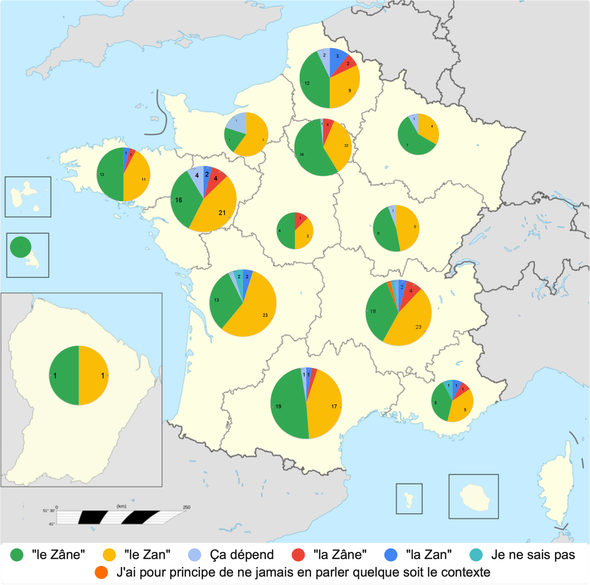 À l’inverse, les avis sont très partagés entre « zan » et « zâne », dans une égalité presque parfaite. Alors que notre hypothèse était que les réponses recouperaient des spécificités régionales (à l’image de la « chocolatine » du Sud-Ouest) nous ne relevons pas un tel clivage.