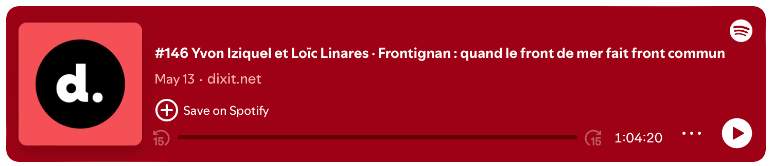 Frontignan montre l’importance de réfléchir aujourd’hui pour garder des portes ouvertes demain. Reste évidemment à voir si ce travail permettra de passer à l’action. D’autres territoires sont confrontés au même compte à rebours. Il faut choisir entre deux options : attendre d’avoir les pieds dans l’eau, ou saisir ce sursis pour imaginer, ensemble, un futur habitable. Pour en savoir davantage, Sylvain nous emmène en promenade sur le Lido de Frontignan, à la rencontre d’Yvon Iziquel, chef du service Espaces Naturels de Sète Agglopôle Méditerranée, et de Loïc Linares, élu à la commune de Frontignan et vice-président de l’Agglopôle.