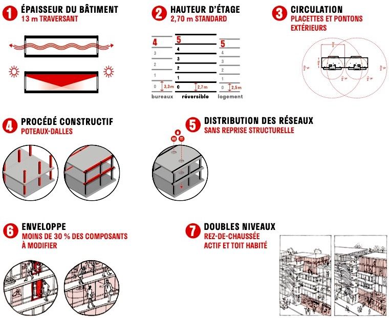 Une autre facette de votre travail est la question de la réversibilité. Votre ouvrage de 2017, un travail expérimental documenté sur les solutions théoriques de réversibilité, correspond bien à un slogan que j'ai tendance à beaucoup répéter : dire qu'un bâtiment devrait avoir sept vies – comme un chat – et la nécessité d’anticiper sa fin de vie. Vous faites aujourd'hui une mise en pratique avec deux projets d'immeuble réversibles que vous menez actuellement à Bordeaux et Grigny. Pourriez-vous revenir sur ce principe de réversibilité, vos apprentissages de la phase expérimentale, mais surtout de sa mise en pratique ?