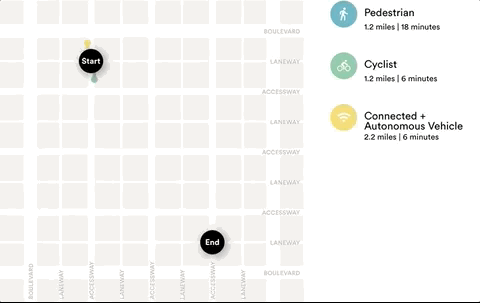 - Laneways. These are 11-metre-wide streets devoted primarily to pedestrians, but which can also accommodate CAVs or micromobility modes (bicycles, scooters, etc.) up to a speed limit of 8 kph.