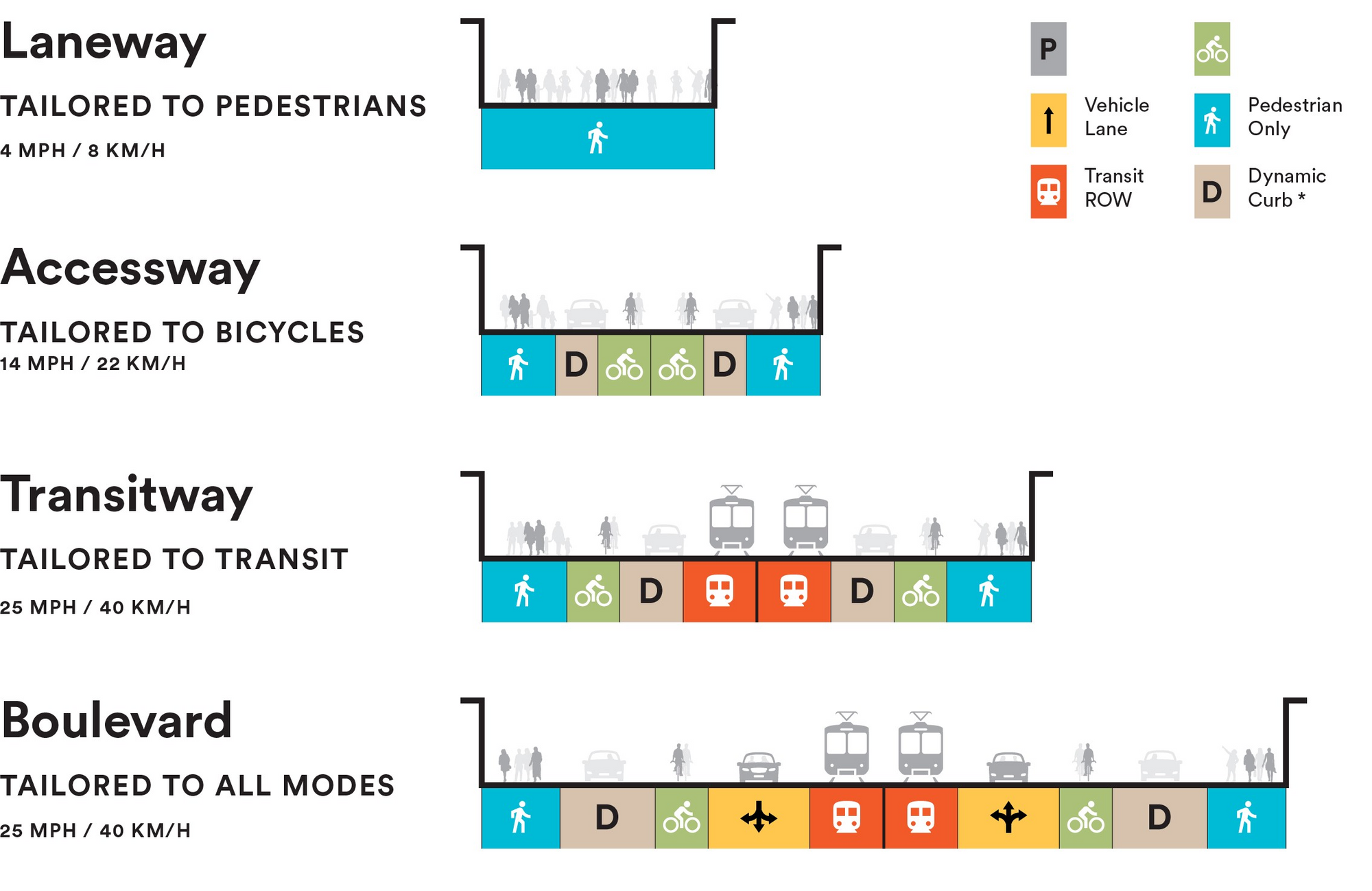 On the basis of these principles, four very different street types are suggested. Each has a priority mode of transportation and a maximum speed, with a portion of space allocated dynamically. Most of this space is recaptured from what was previously parking, which is systematically removed in all the street types. Looking in detail, this results in: