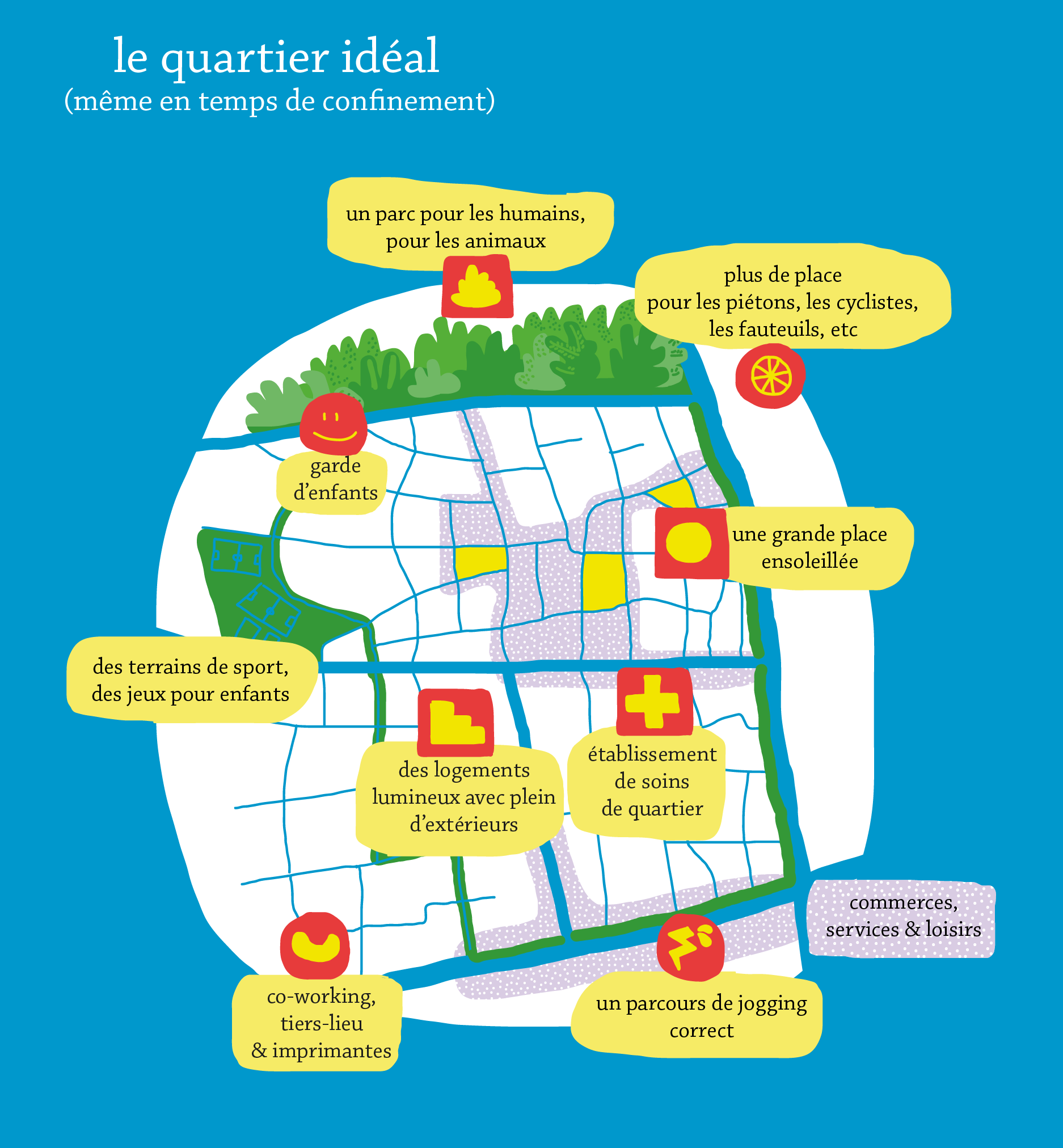 Et puis il y a le retour de la proximité. Que ce soit la ville du quart-d'heure de la Maire de Paris, ou celle du 1 km de son préfet (à peu près la même, les parcs en moins et les formulaires en plus), l'échelle du quartier reprend peu à peu ses droits. Dans la métropole, la ville moyenne ou le village, c'est l'échelle du petit commerce, de la marche, du voisin. L'échelle dont on ferait bien son quotidien, quitte à faire quelques coups de pédale pour sortir parfois un peu du cercle. Mixité des fonctions dans des espaces où on peut vivre et travailler, multiplication des services, diversité des commerces, liberté des usages dans des distances qui permettent de laisser la voiture au garage... Rien de neuf, mais c'est l'antithèse des espaces monofonctionnels qui font encore le quotidien de la pratique de l'urbanisme d'aujourd'hui, et de la vie des français.
